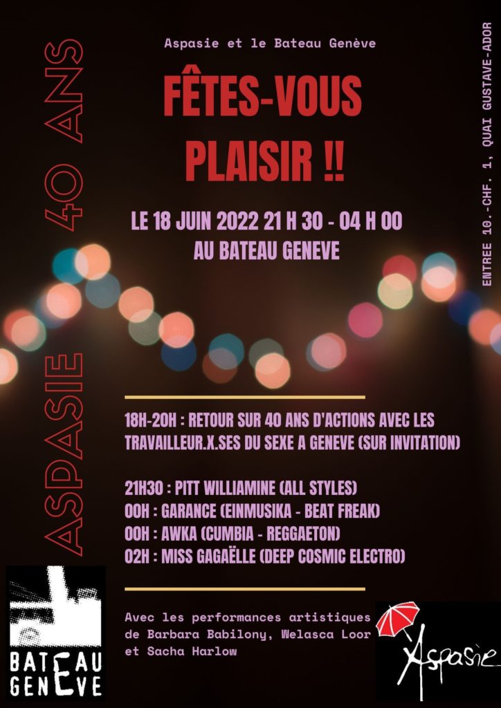 Cette soirée, organisée au Bateau Genève, sera l’occasion de mener ensemble une rétrospective sur les actions menées pendant 4 décennies avec les travailleuses et travailleurs du sexe à Genève (18h00-20h00).